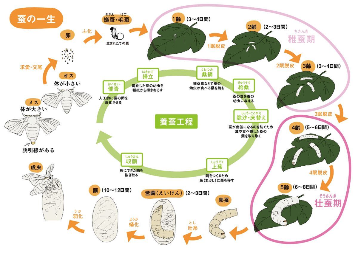 ▲ 蚕の一生 工程:給桑と徐沙、床替え