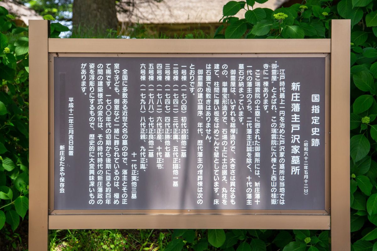 新庄藩主戸沢家墓所は、江戸時代最上地方一円を治めた戸沢家歴代の墓所です。全国に多数ある近世大名の墓の中で、藩主とその正室や子ども、側室など一緒に葬られている極めて珍しい墓所です。「御霊屋(おたまや)」と呼ばれ、総ケヤキ造りの均整がとれた美しい建物6棟が並んでいます。営業時間/通年住所/〒996-0091 新庄市十日町468-12TEL/0233-22-2111(新庄市役所)駐車場/10台交通・アクセス/JR新庄駅から車で約10分