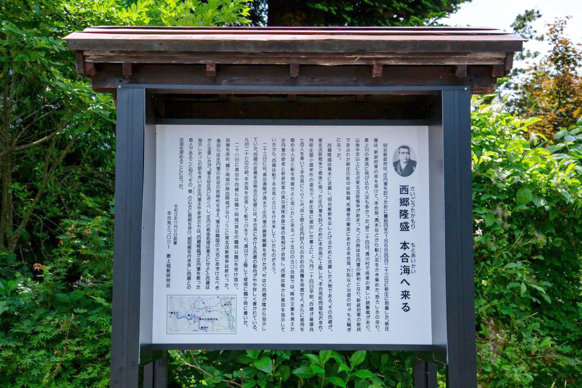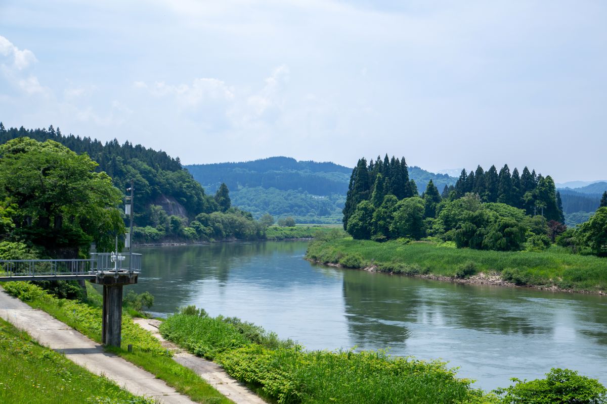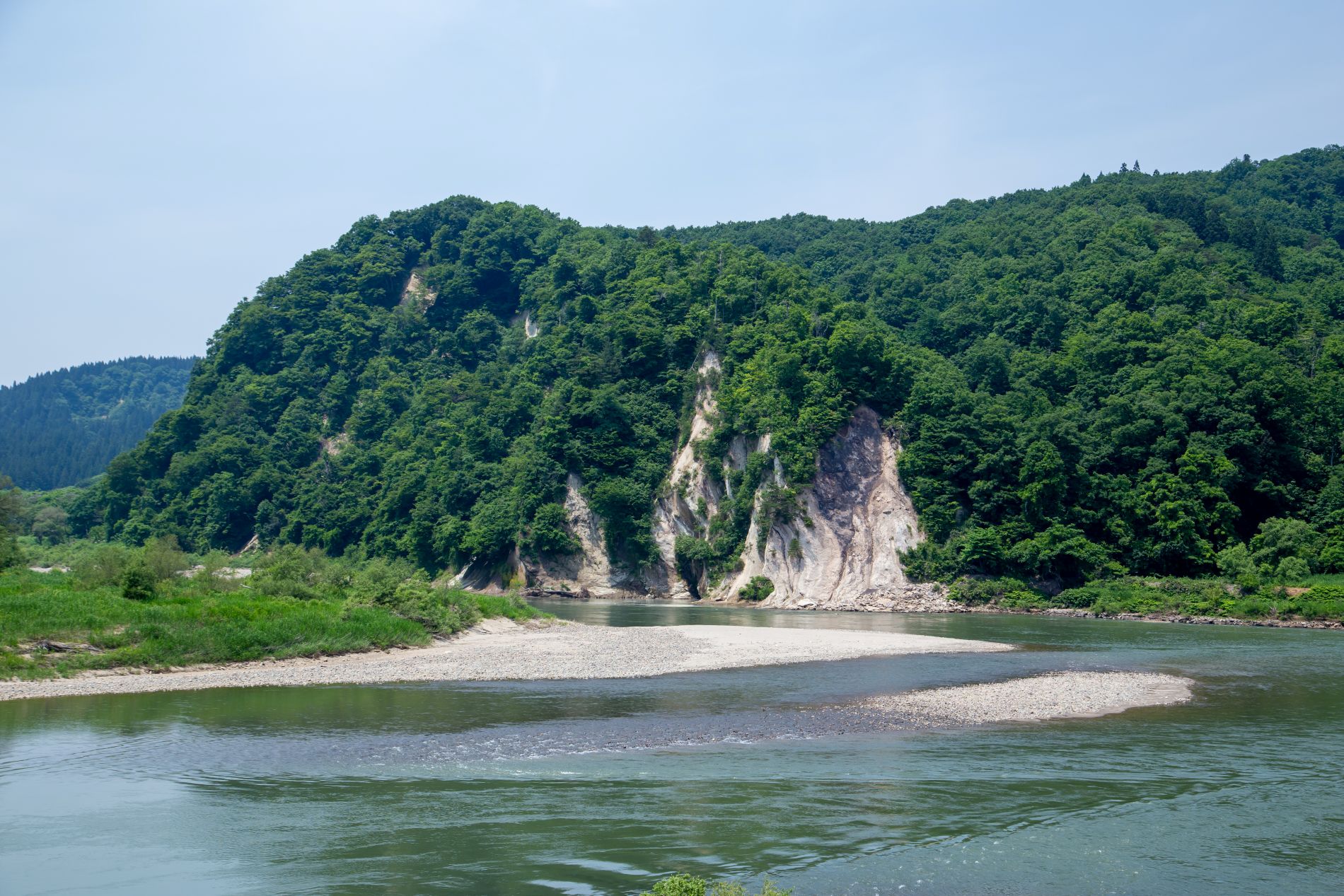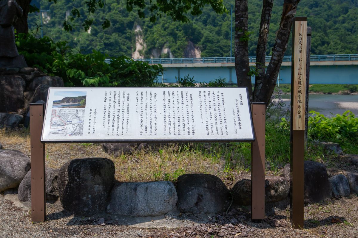 平成26年10月に「おくのほそ道の風景地」のひとつとして国名勝に指定されました。国道47号本合海大橋のあたりから見える白い崖の上に八向楯あとがあり、義経一行も拝んだとされる赤い社の矢向神社があります。秋には紅葉スポットとしても人気となっています。